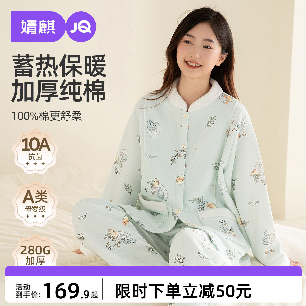 婧麒月子服秋冬空气棉孕妇睡衣纯棉100%全棉产后哺乳家居服套装女