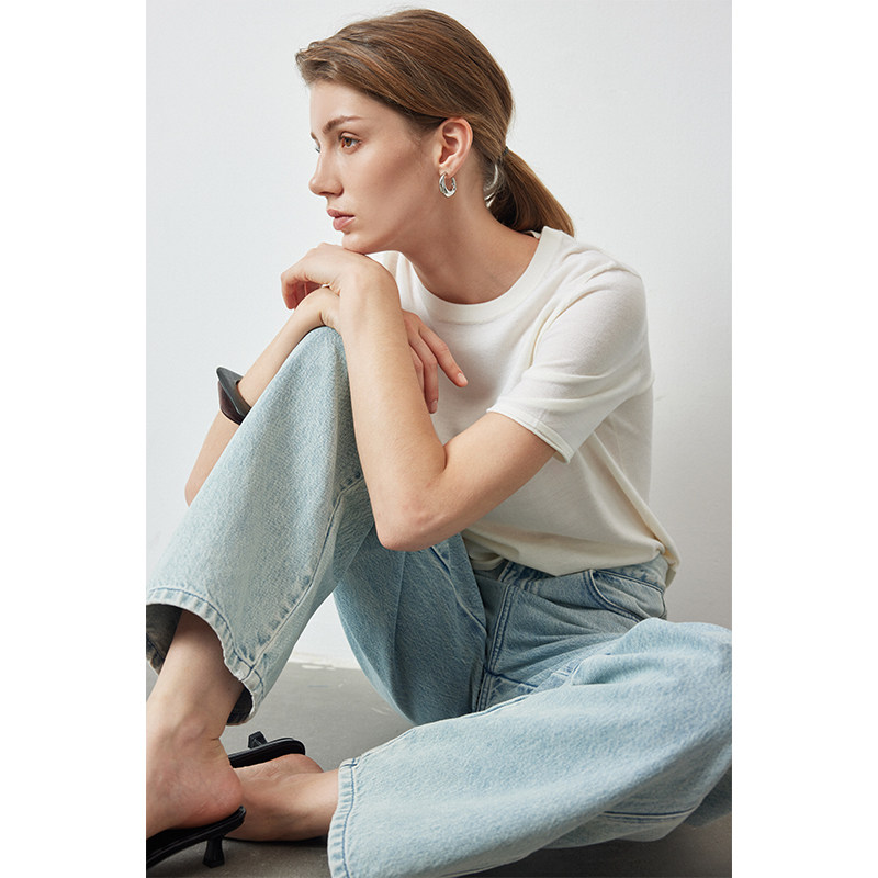 因由 百搭宽松薄款短袖ROW风极简羊毛针织半袖纯色圆领百搭T恤女