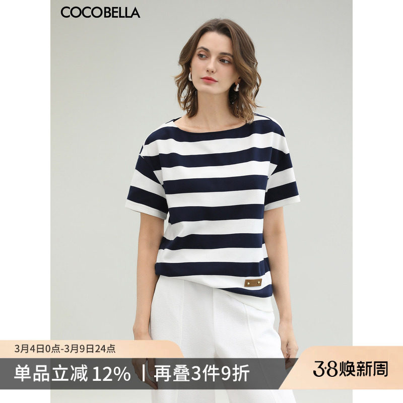 预售COCOBELLA一字领蓝白条纹短袖T恤女26春夏通勤针织半袖TS635