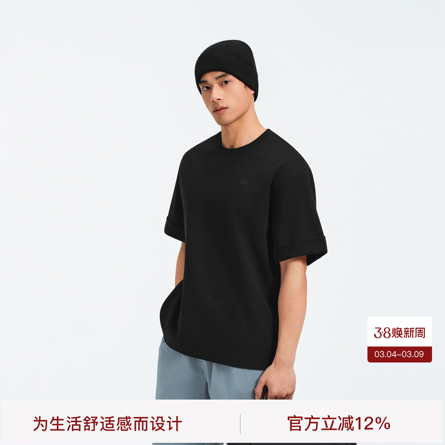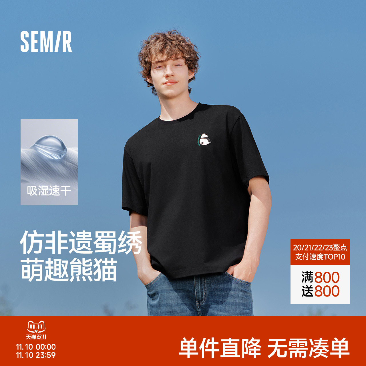 森马短袖T恤男吸湿速干新中式熊猫刺绣25夏季新款上衣针织半袖黑