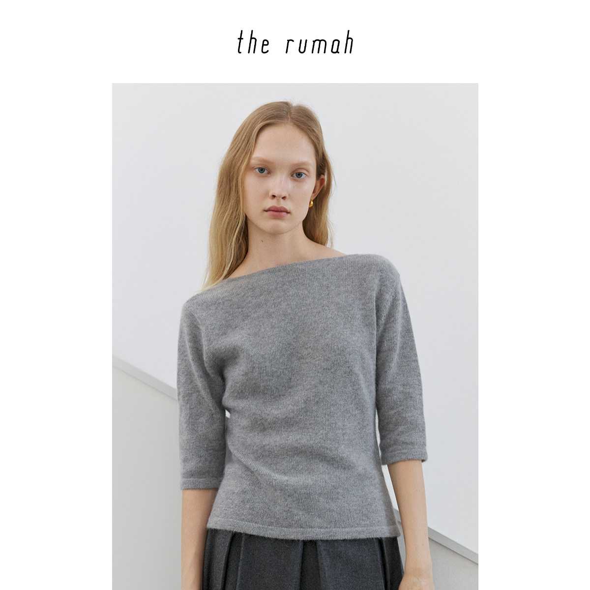 折扣特惠 therumah灰色兔毛U领针织半袖进口机织正反两穿显瘦上衣