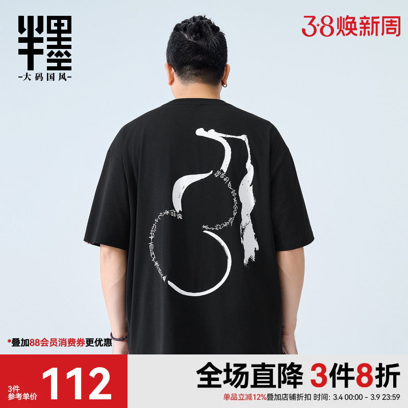 半墨大码男装肥佬短袖T恤男2026新款胖子宽松中国风印花针织半袖