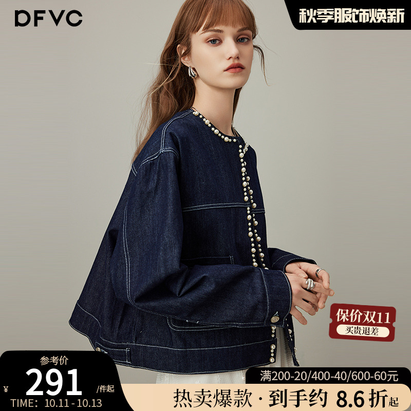 dfvc韩版短款牛仔外套女2025年秋季新款珍珠明线圆领休闲显瘦夹克