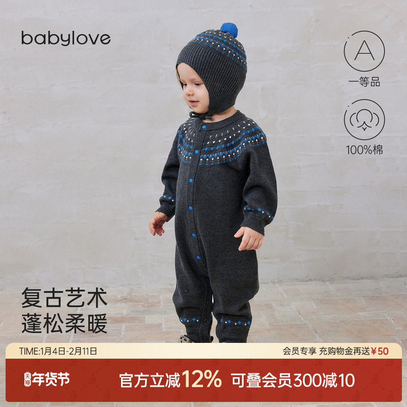 babylove婴儿针织连体衣春秋纯棉毛线衣服宝宝保暖哈衣时尚外出服