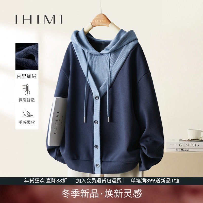 IHIMI海谧假两件超火加绒连帽卫衣2025秋季新款女士爆款休闲上衣