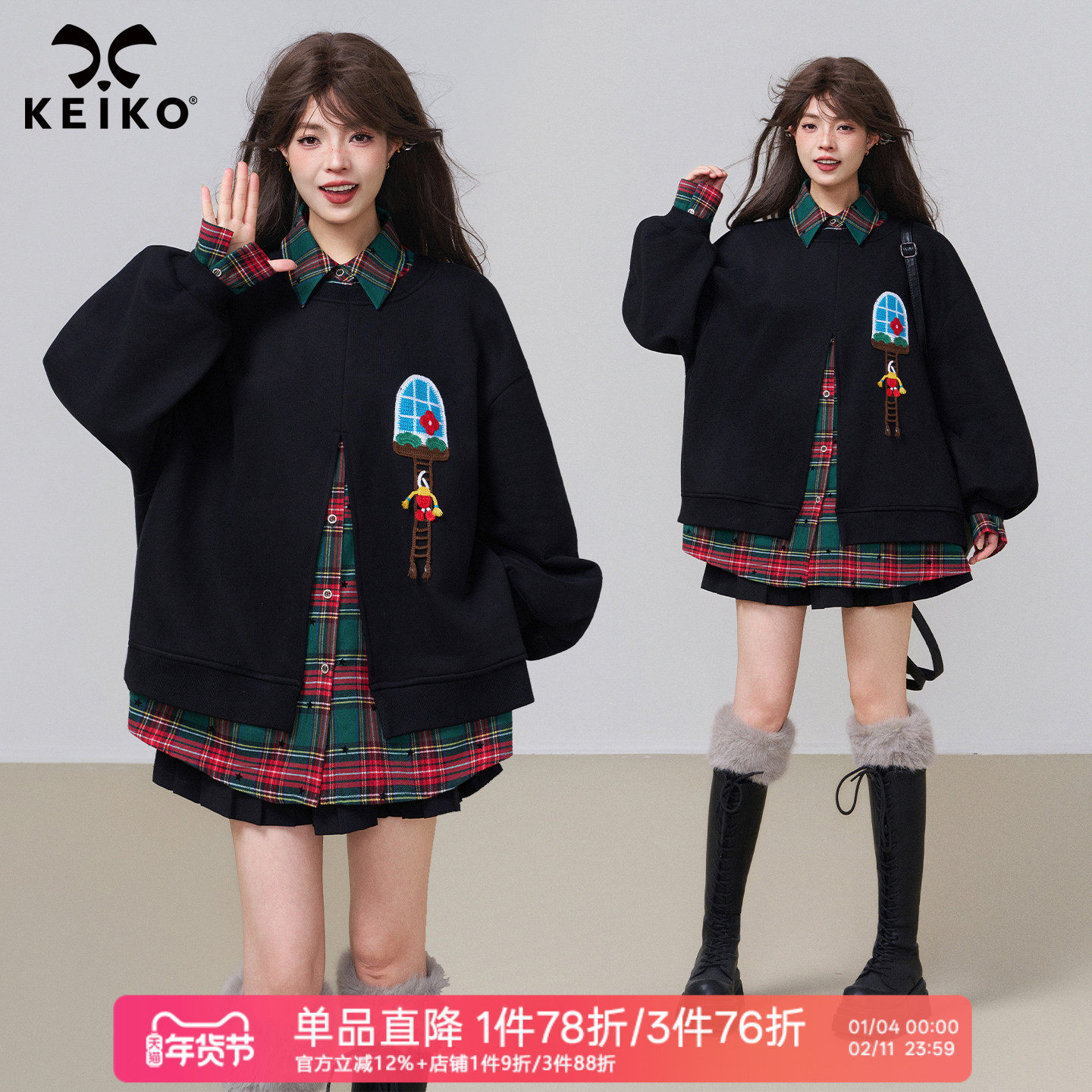 KEIKO 学院风假两件拼接黑色加绒卫衣女秋冬错序感宽松polo领外套