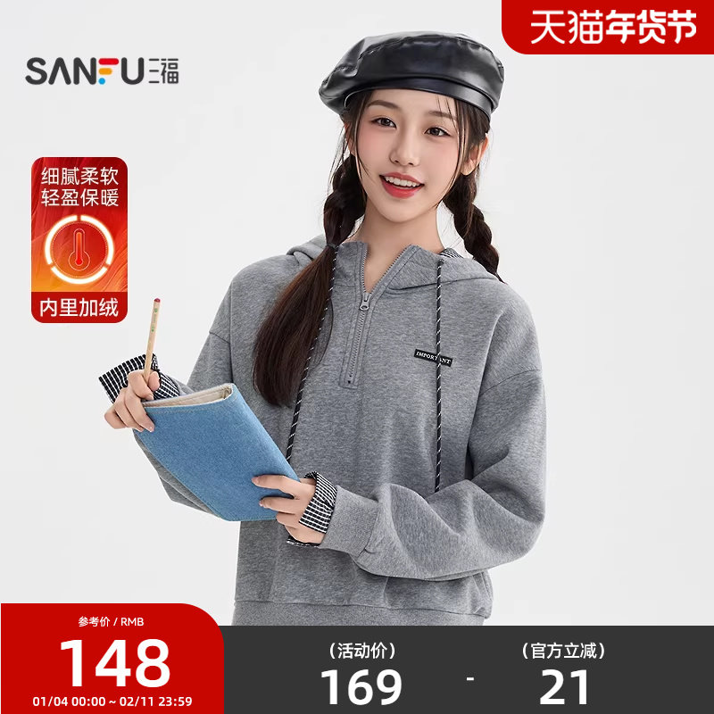 三福灰色卫衣2025新款冬季格子拼接假两件加绒连帽上衣女装512259