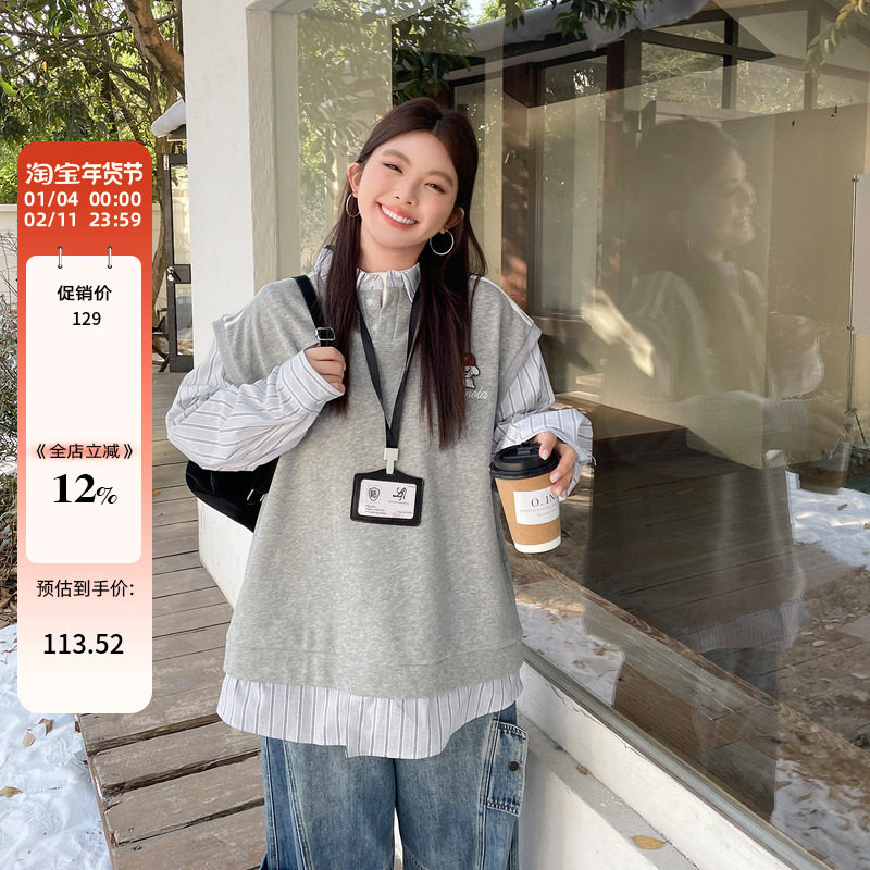 小C家 假两件圆领卫衣女2025新款秋季宽松慵懒风加绒长袖套头上衣