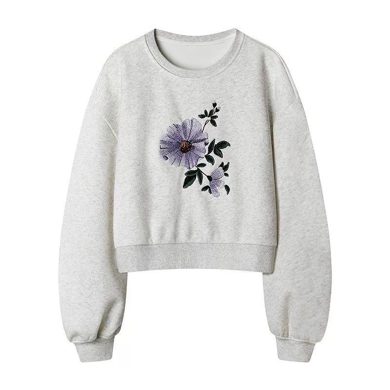 法国小众gw新款 加绒格雷系花朵刺绣卫衣女宽松套头圆领长袖上衣