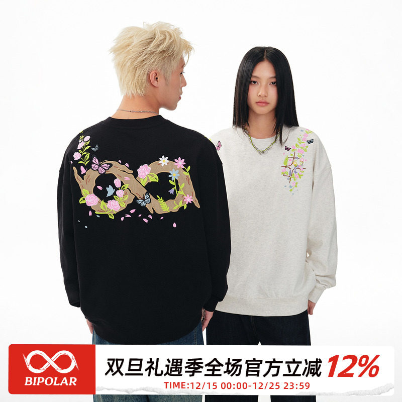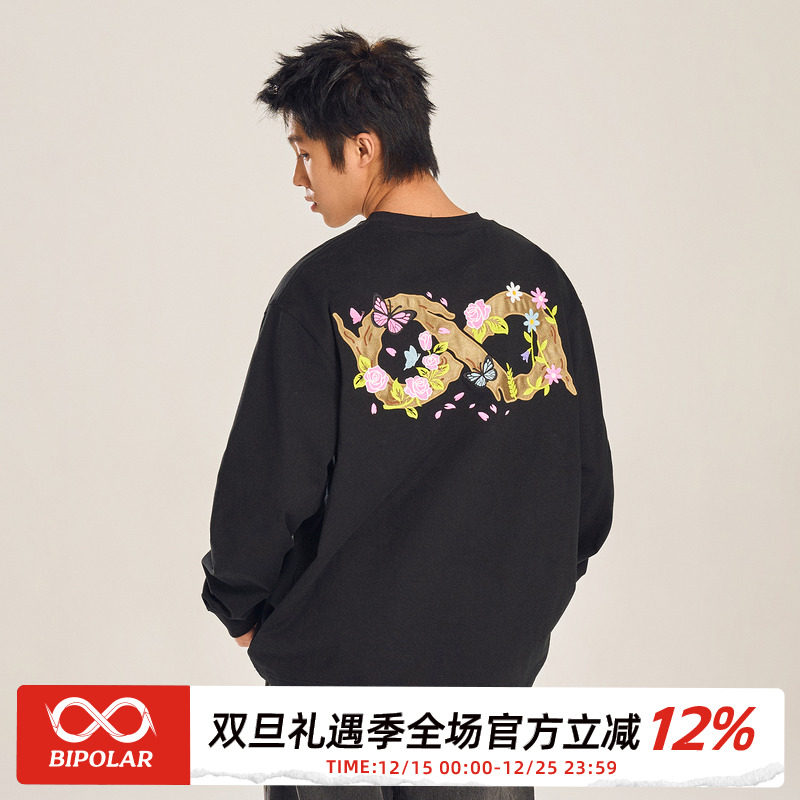 BIPOLAR刺绣花朵B标过肩圆领卫衣美式休闲复古感上衣T恤男女款秋