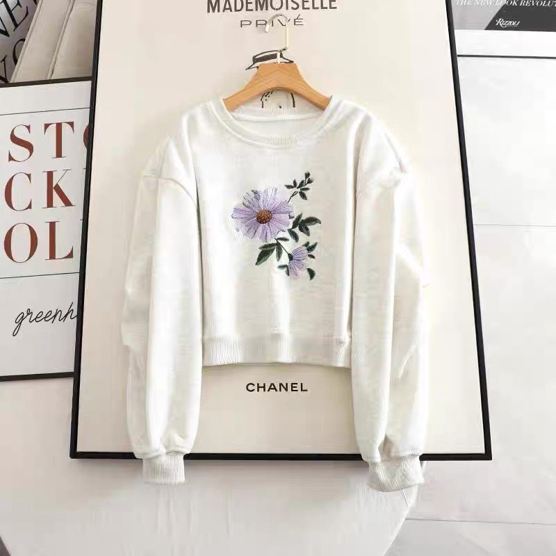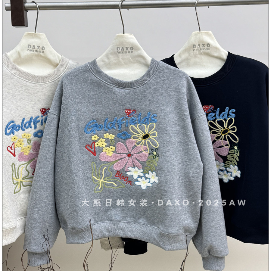 花儿朵朵!秋冬韩国花朵刺绣圆领加绒加厚宽松保暖慵懒卫衣 上衣