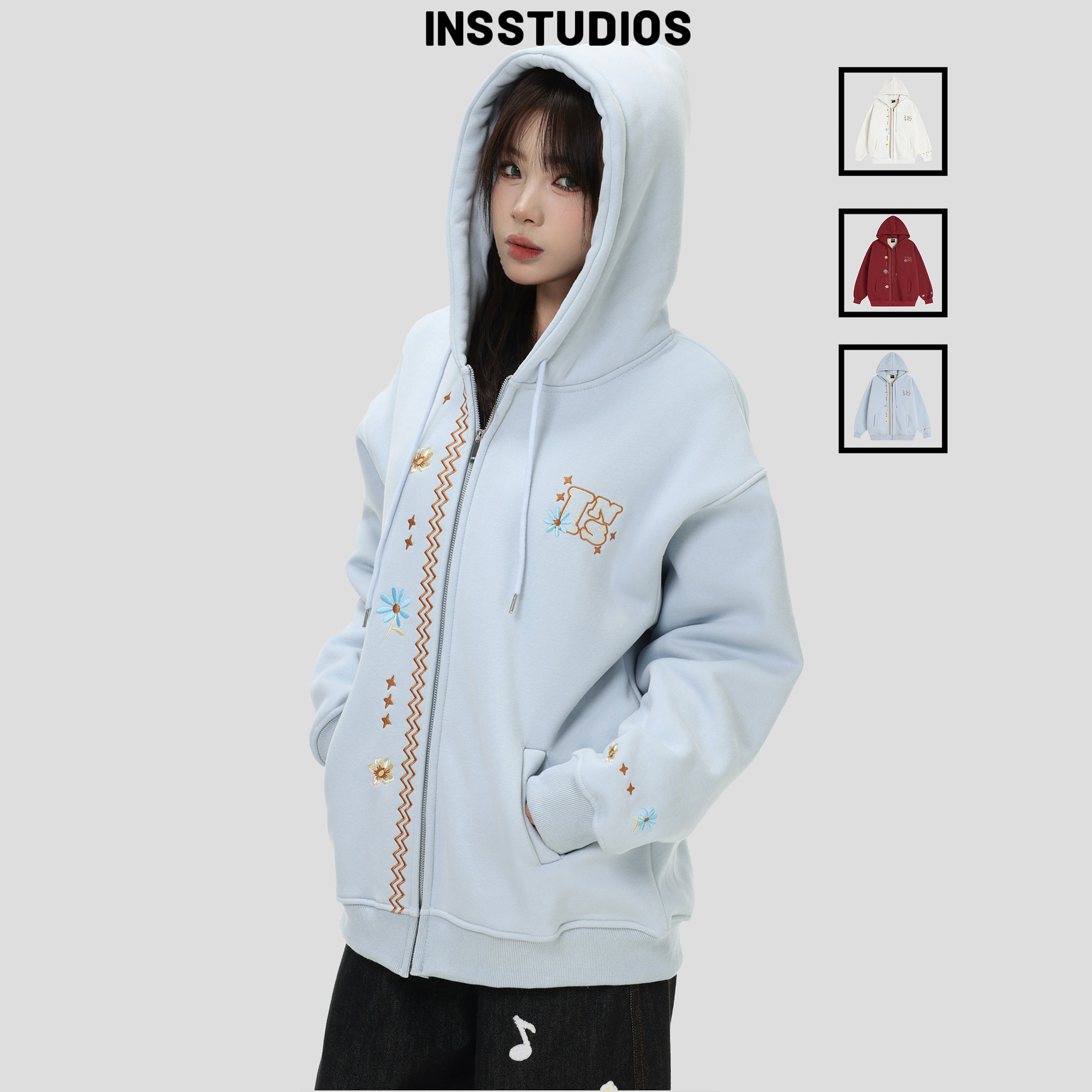 INSstudios 国潮美式「花朵刺绣LOGO连帽卫衣」宽松加绒帽衫上衣