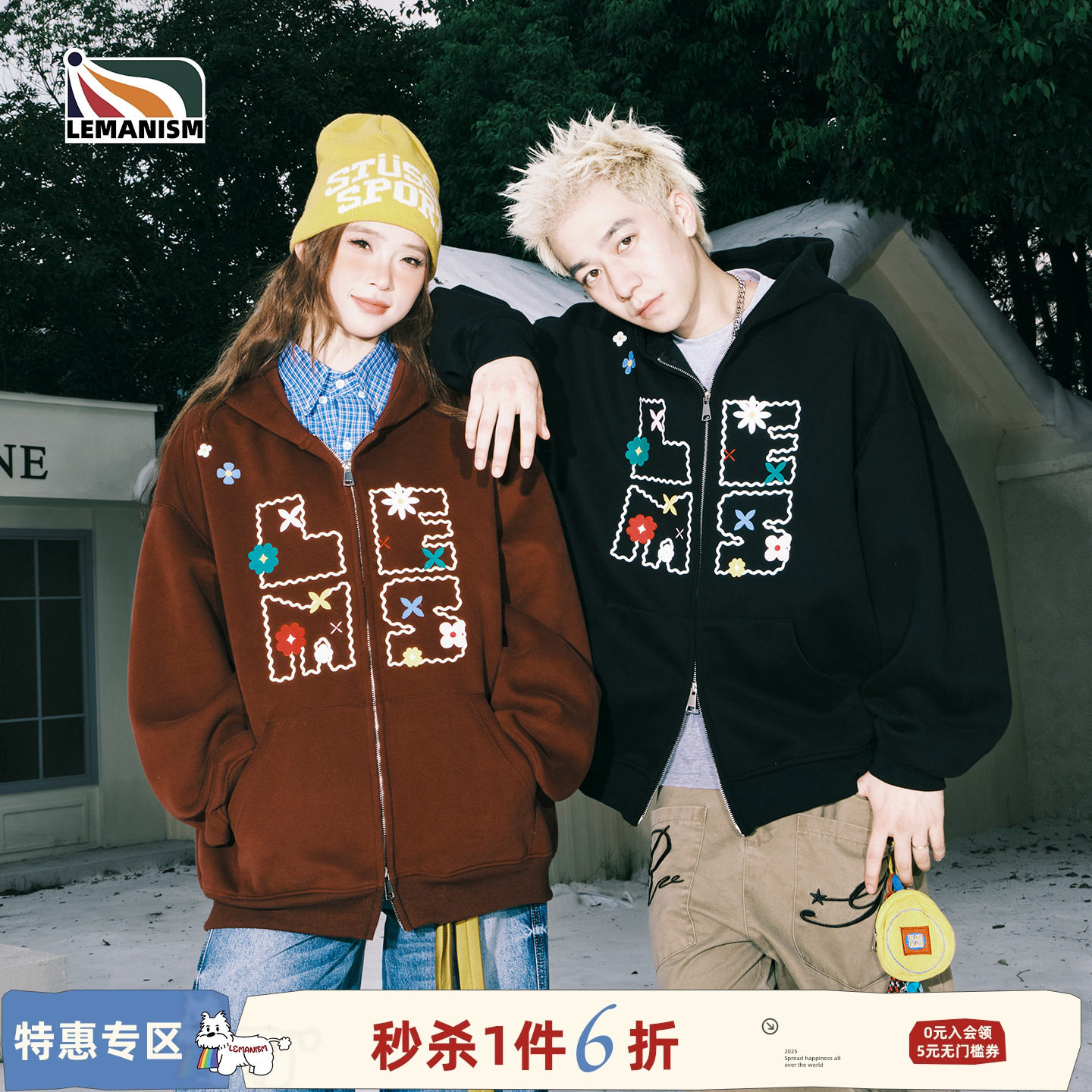 lemanism美式潮流花朵字母刺绣开衫连帽卫衣男2025新款春秋上衣