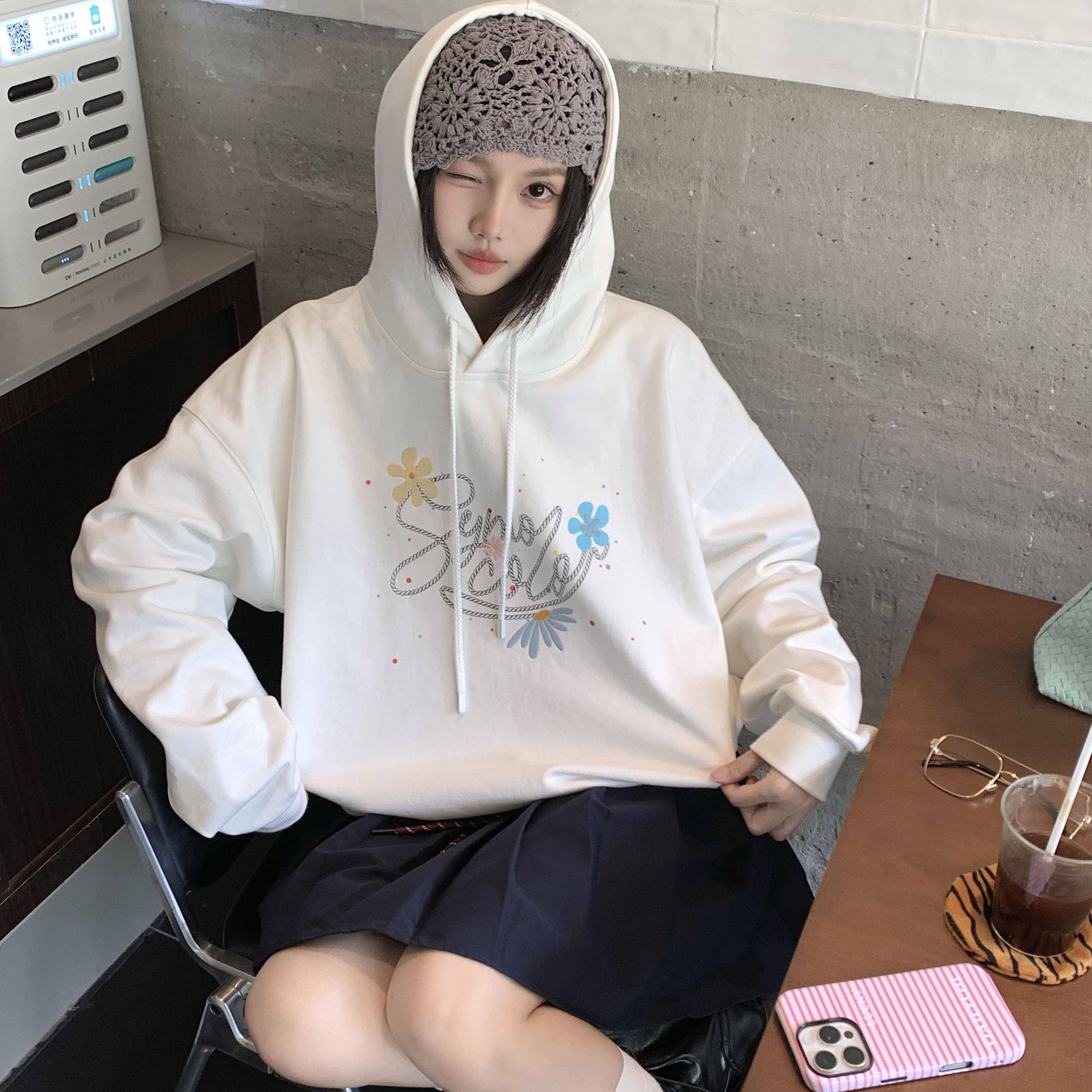 EU/EUSOUEU小花朵撞色贝壳刺绣帽檐贴布印花休闲百搭情侣连帽卫衣