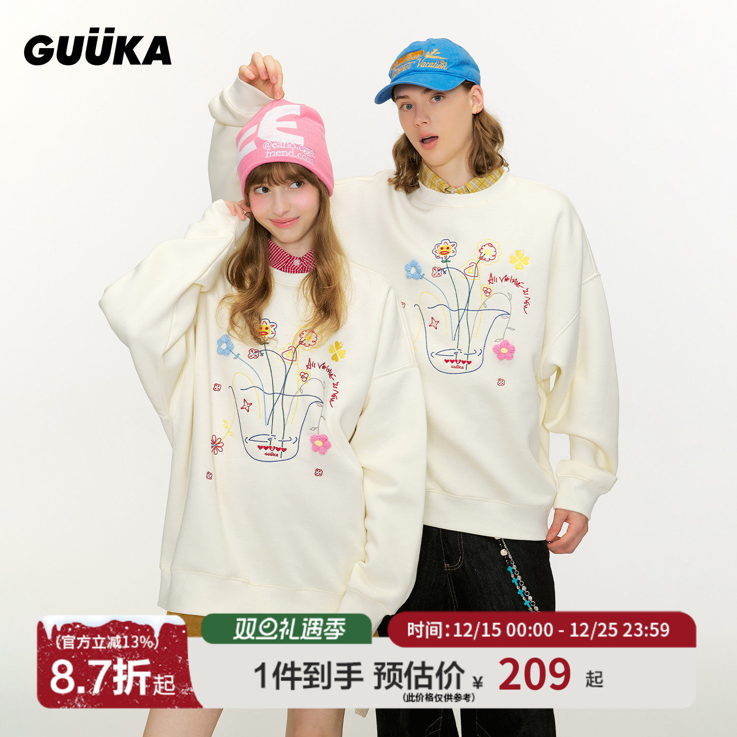 GUUKA潮牌白色立体花朵刺绣圆领卫衣男 情侣冬季加绒落肩上衣宽松