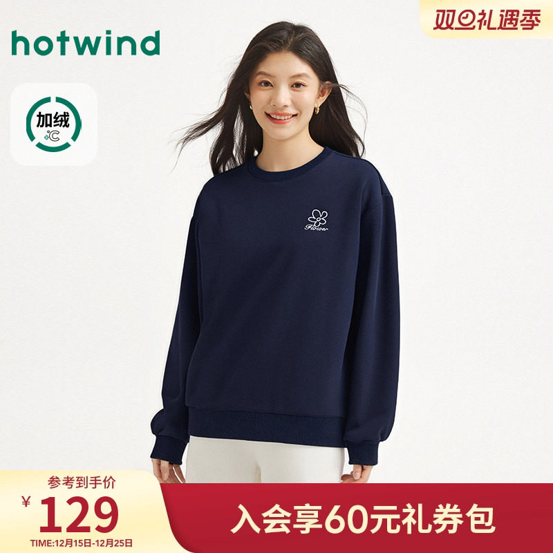 热风2025年冬季新款女士花朵刺绣加绒圆领卫衣软糯亲肤减龄显嫩