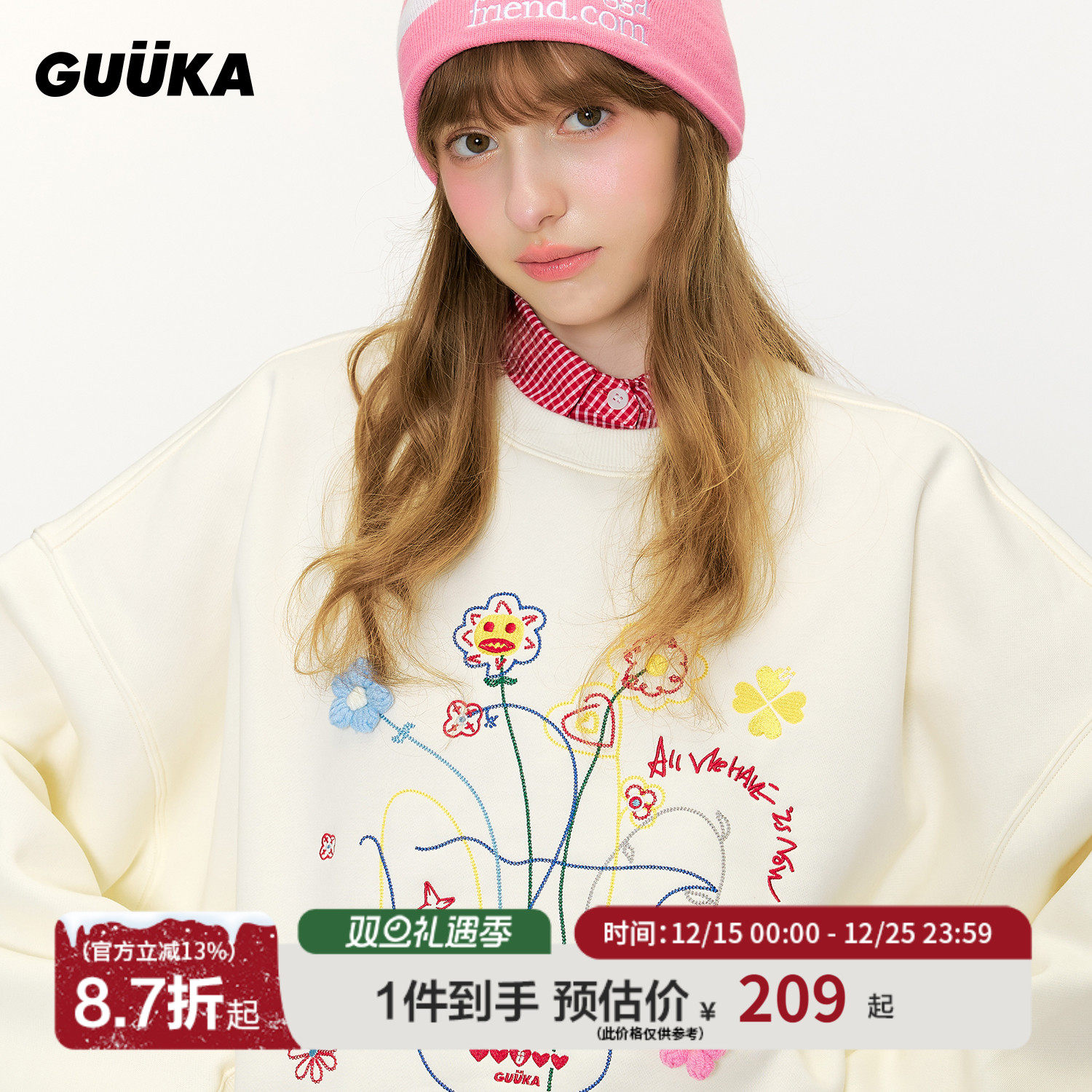 GUUKA潮牌白色圆领卫衣女冬季加绒加厚 立体花朵刺绣落肩上衣宽松
