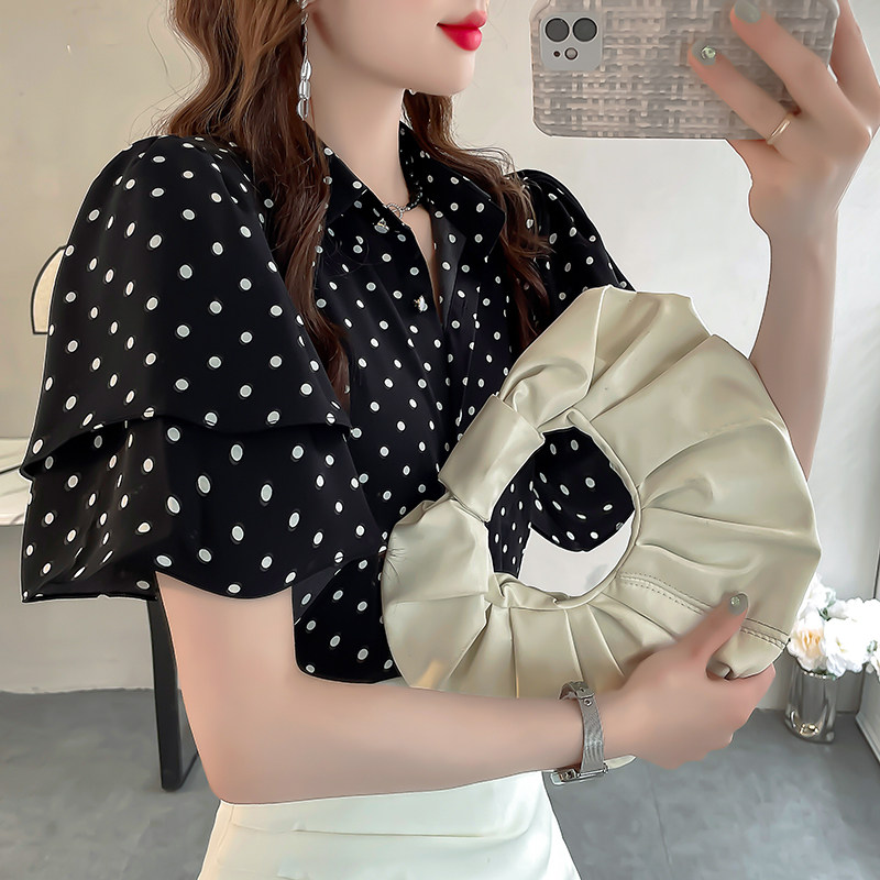 韩版波点印花雪纺女衬衫轻奢高级感衬衣洋气宽松荷叶边短袖上衣夏