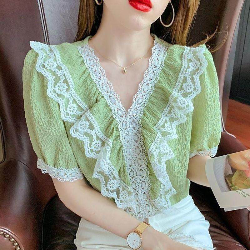 新款韩版夏季新款泡泡袖小衫荷叶边上衣蕾丝边V领短袖雪纺衬衫女