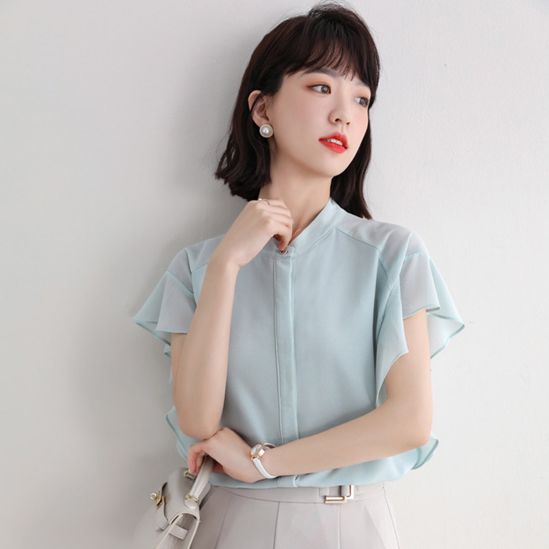 2020新款韩版女装夏装短袖雪纺衫女荷叶边修身显瘦职业白色打底衫