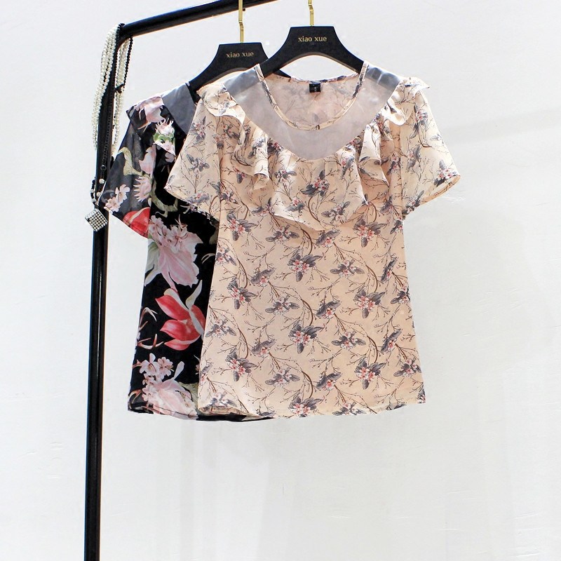 夏季新款韩版大码碎花短袖雪纺衫显瘦欧根纱荷叶边气质胖mm女上衣