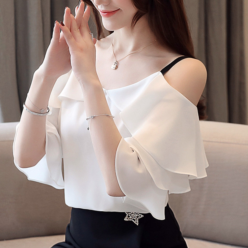 雪纺荷叶边短袖衬衫女夏季新款韩版时尚时髦喇叭袖一字肩小衫上衣