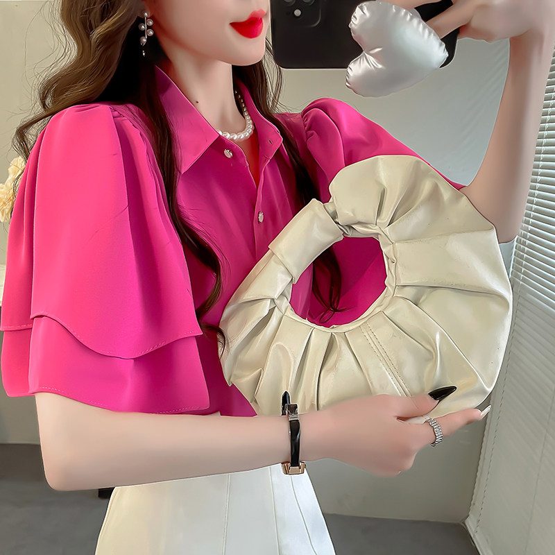 韩版宽松雪纺上衣女夏轻奢高级感衬衣荷叶边设计纯色短袖翻领衬衫