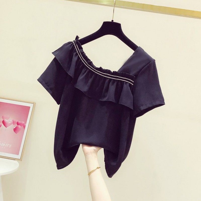 雪纺衫女短袖夏季韩版潮女装大码宽松胖mm荷叶边上衣一字领打底衫