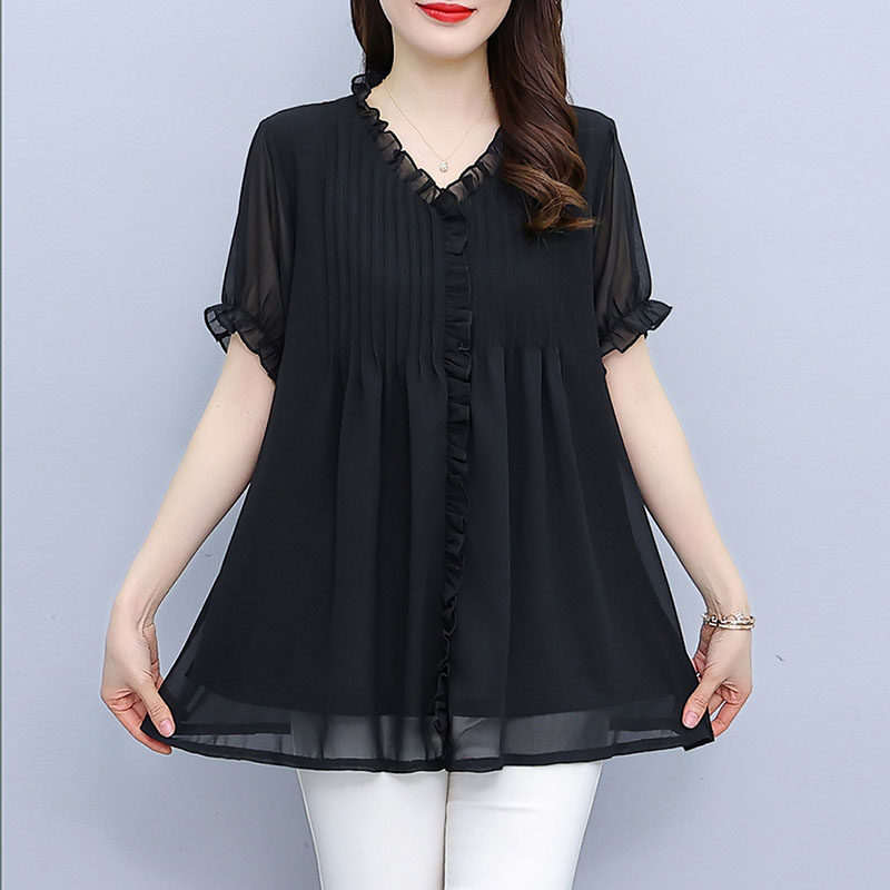 大码夏季韩版遮肚荷叶边V领雪纺衫女短袖洋气宽松妈妈中长款上衣