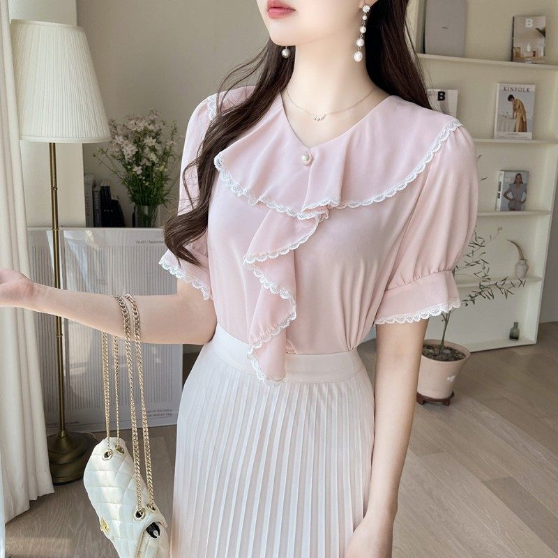 短袖雪纺衫上衣女夏装2024新款韩版时尚荷叶边法式高级感漂亮小衫