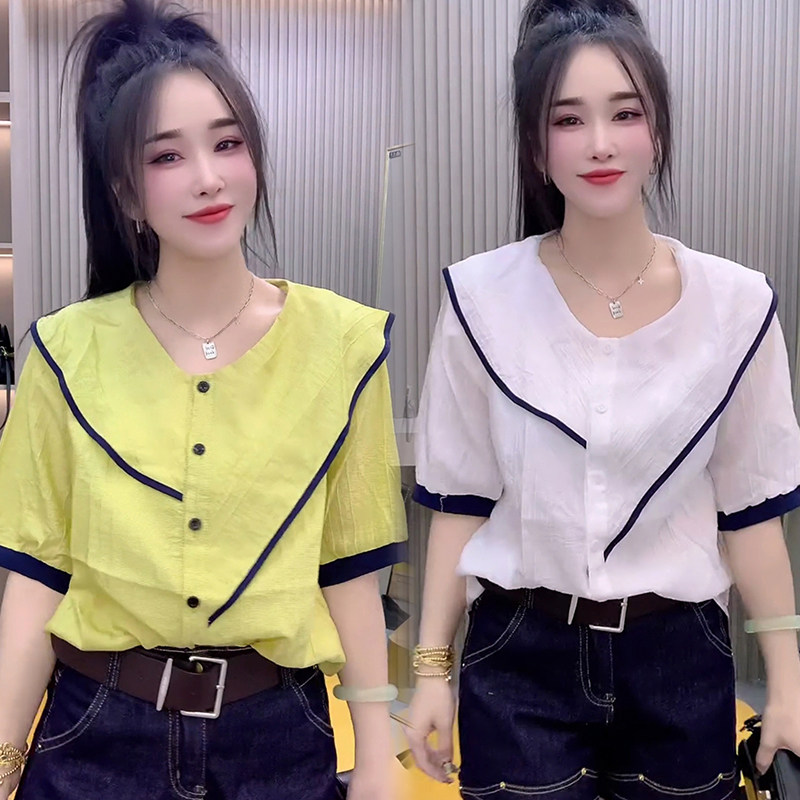2024韩版夏季衬衫女士雪纺 花边荷叶短袖宽松上衣遮肚子 显瘦衬衣