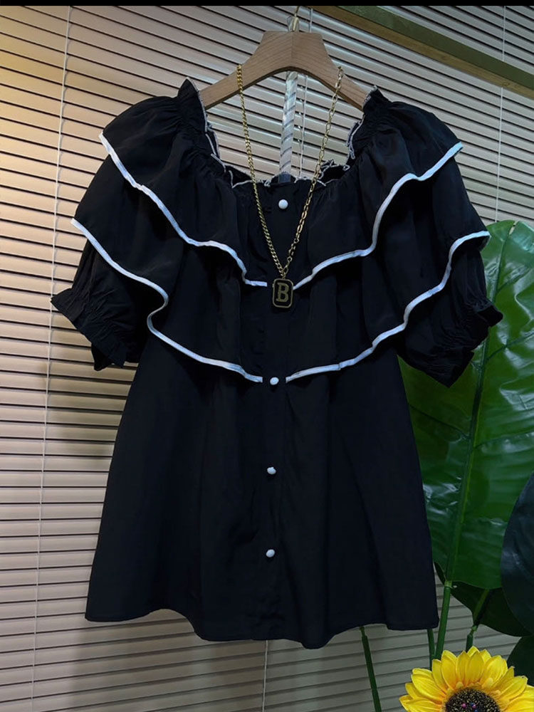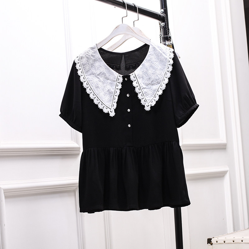 娃娃领雪纺衫短袖大码宽松显瘦荷叶边百搭韩版胖MM黑衬衣设计感夏