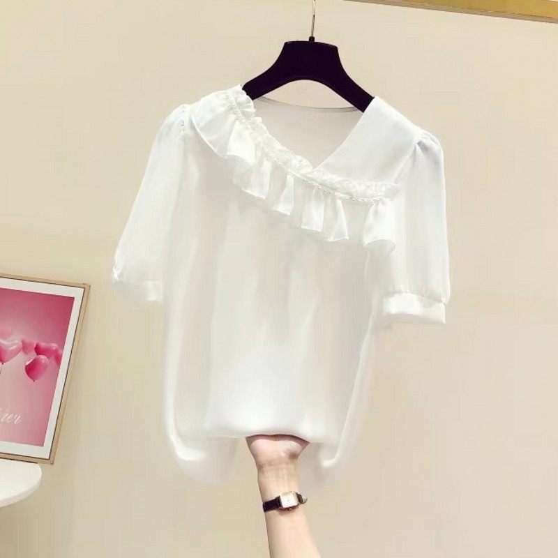 衬衫女士雪纺短袖荷叶边2024夏季新薄款宽松韩版气质大码修身上衣