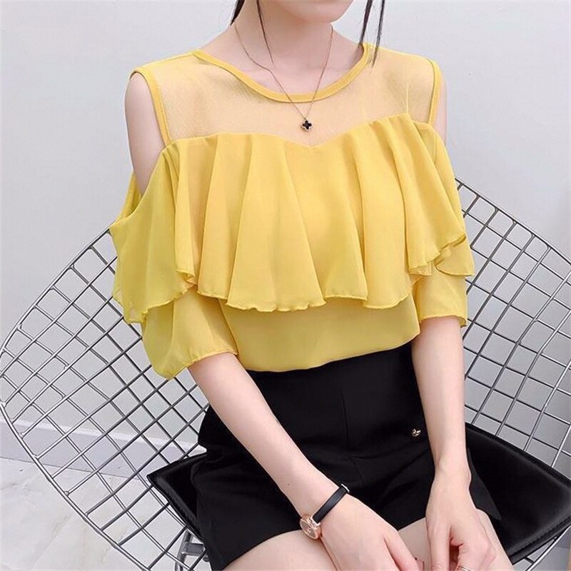 春夏季新款韩版拼接荷叶边雪纺衬衫女百搭宽松短袖露肩圆领上衣女