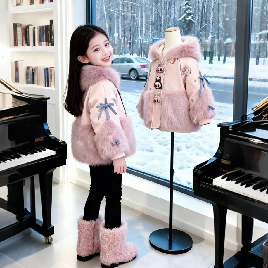 • 女小童加绒加厚仿皮草大衣女宝宝连帽中长款卡通外套女童冬装洋气