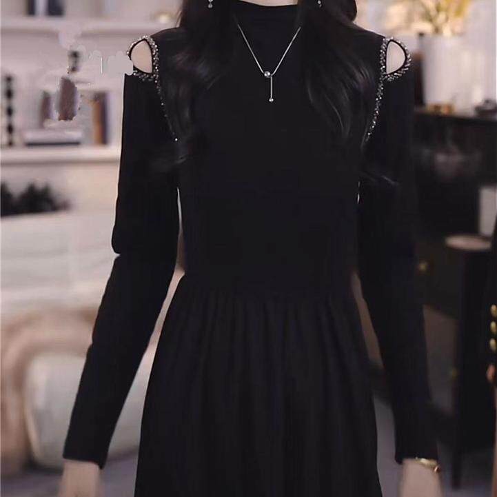 气质性感夜店酒吧高腰开叉露肩设计长款黑色高端连衣裙御姐名媛风