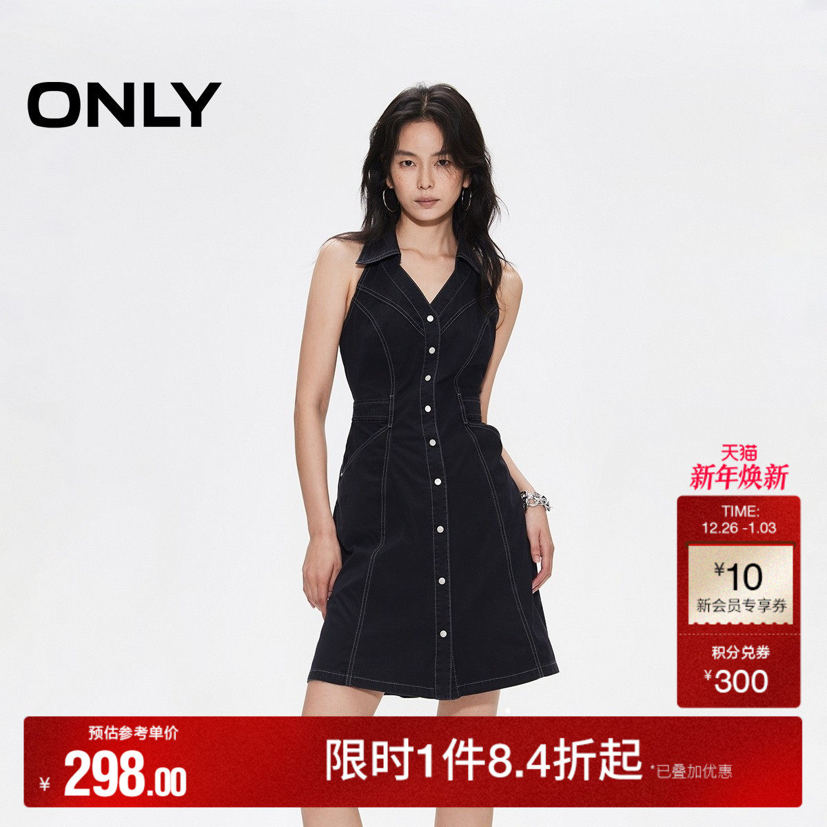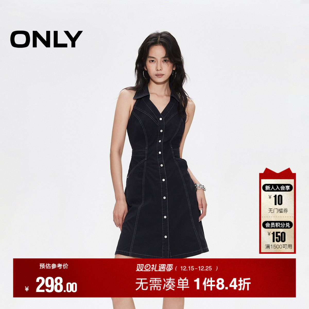 ONLY2025夏季新款性感V字翻领挂脖高腰露肩露背短裙牛仔连衣裙女