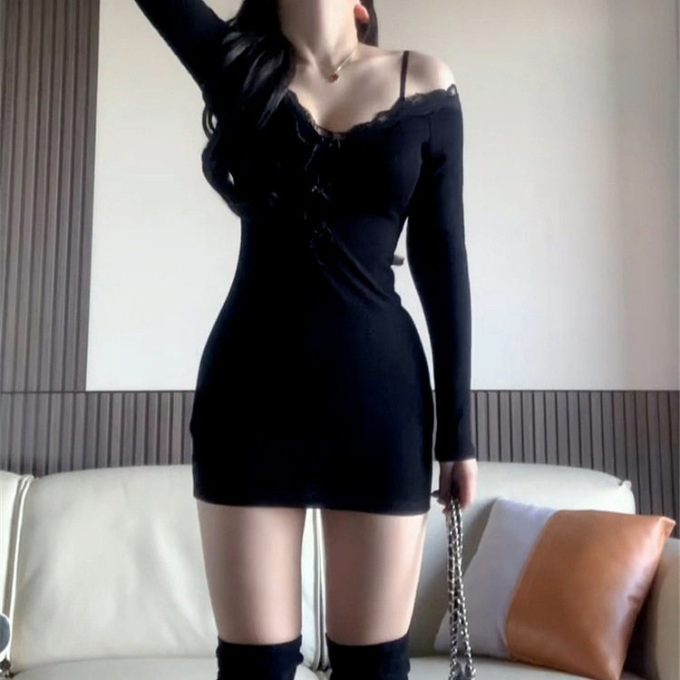 辣妹性感蕾丝花边露肩吊带小黑裙通勤高腰修身显瘦简约包臀连衣裙