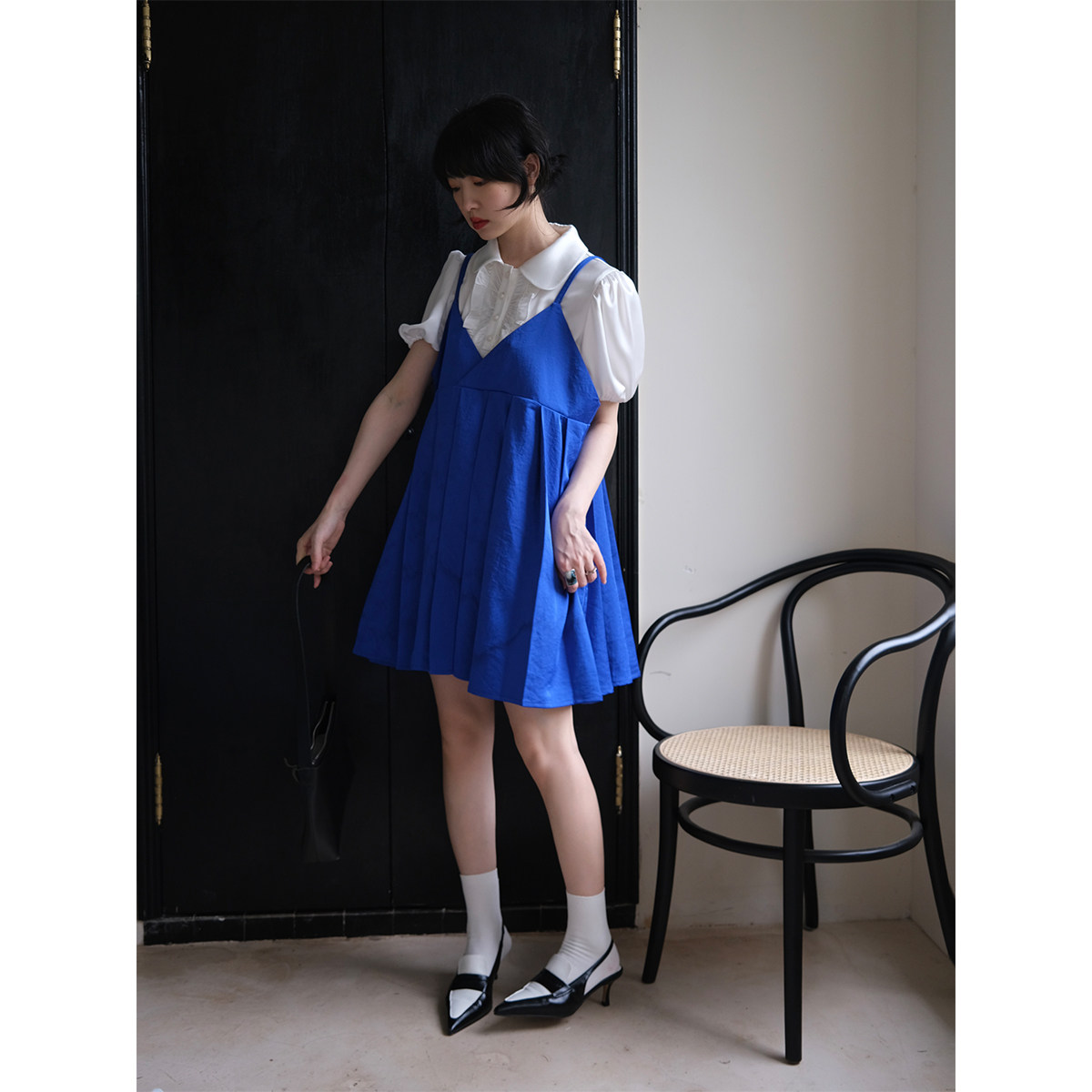 dorydory 褶皱高腰克莱因蓝连衣裙宽松百搭气质露肩吊带裙夏新款