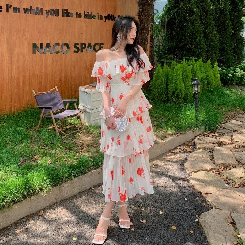 雪纺印花一字领露肩高腰显瘦仙女百褶长裙旅游度假海边漂亮连衣裙