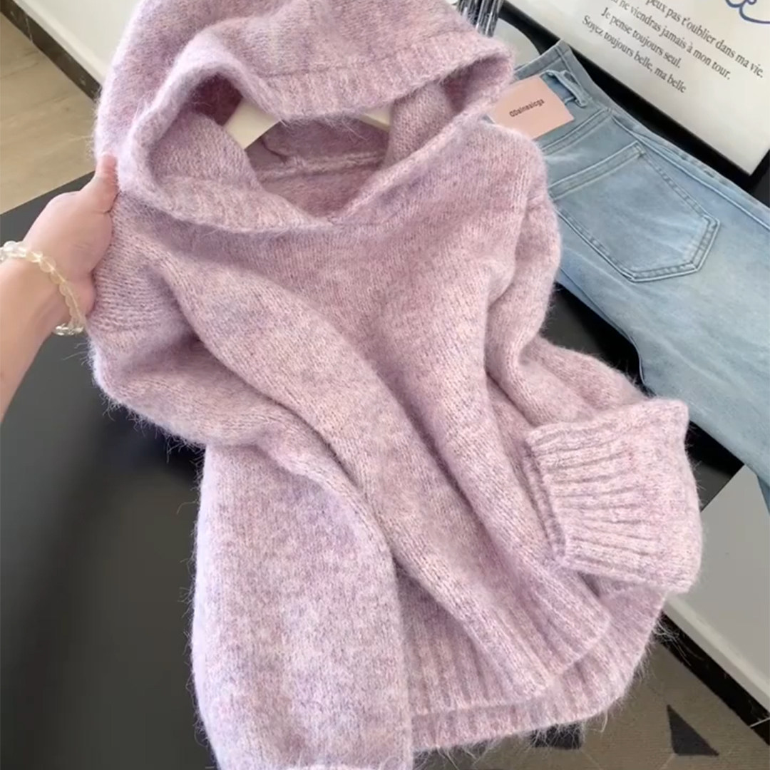 韩系慵懒风紫色连帽套头毛衣女2025秋冬新款宽松显瘦软糯针织上衣