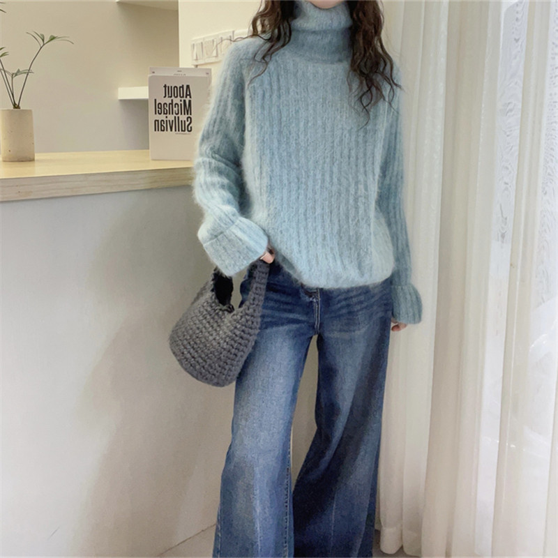 欧货慵懒风高领雾霾蓝女2025秋冬长袖宽松套头毛衣显瘦保暖针织衫
