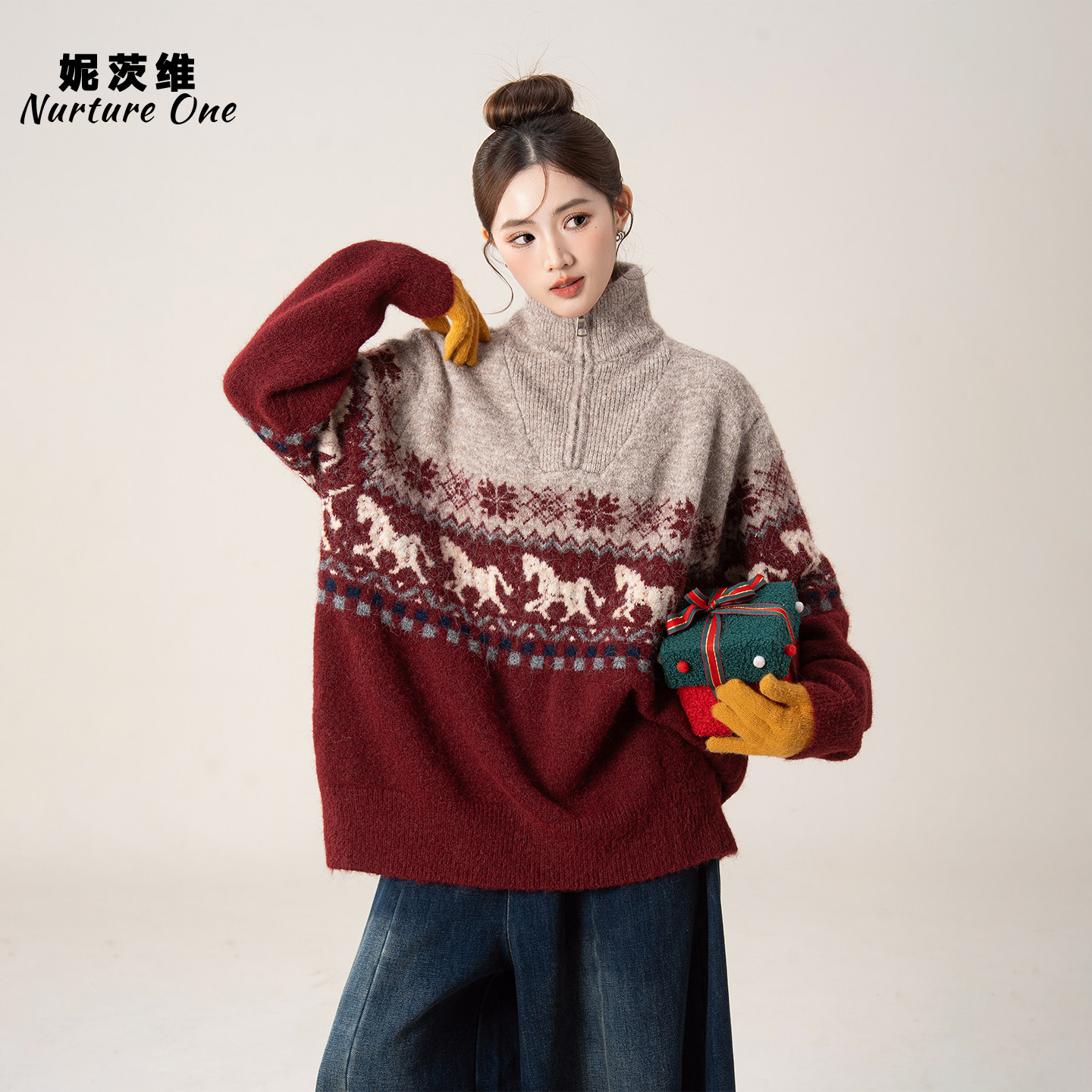 费尔岛风半拉链套头红色毛衣女冬季新款慵懒风宽松显瘦针织衫上衣