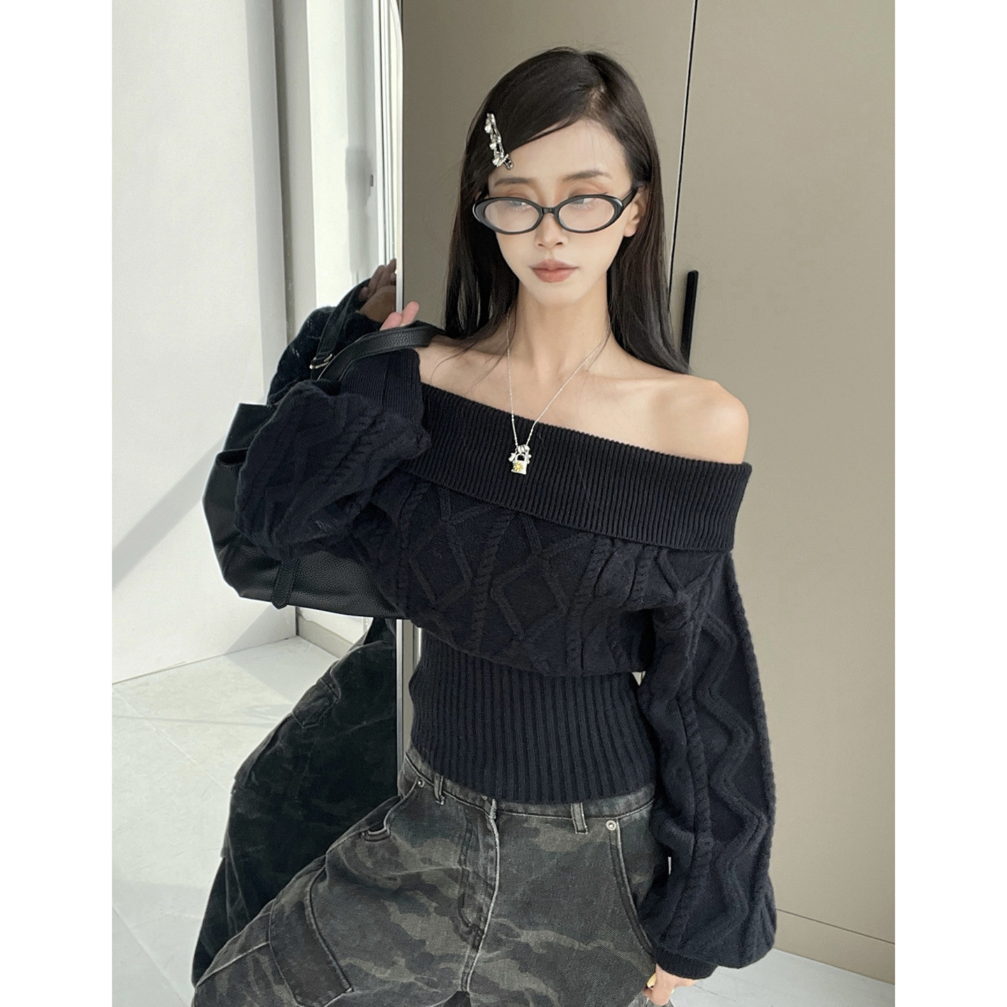 MianCun一字肩黑色套头麻花毛衣女冬季慵懒风宽松显瘦针织上衣
