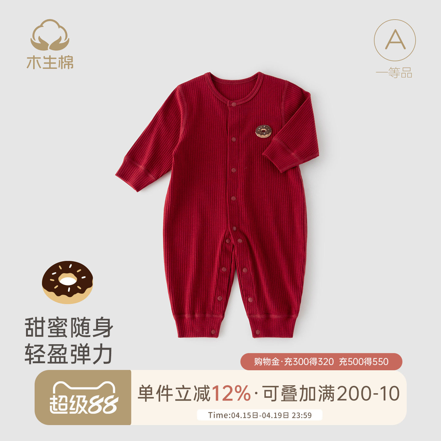 木生棉宝宝长袖连体衣秋冬季婴儿弹力红色喜庆哈衣爬服周岁新年服