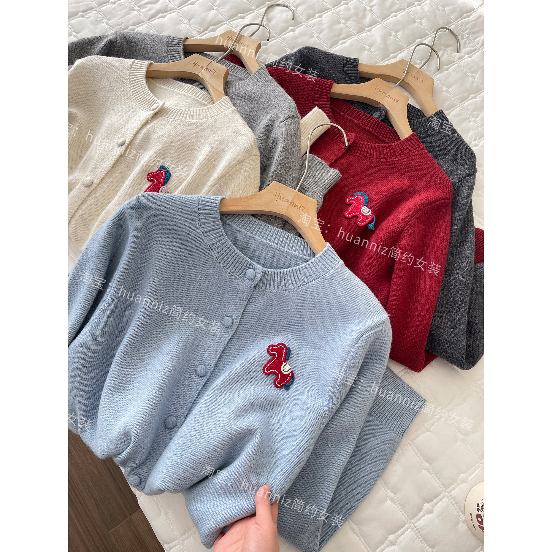 冬洋气小马贴布圆领针织衫单排扣纯色开衫宽松休闲减龄毛衣外套女