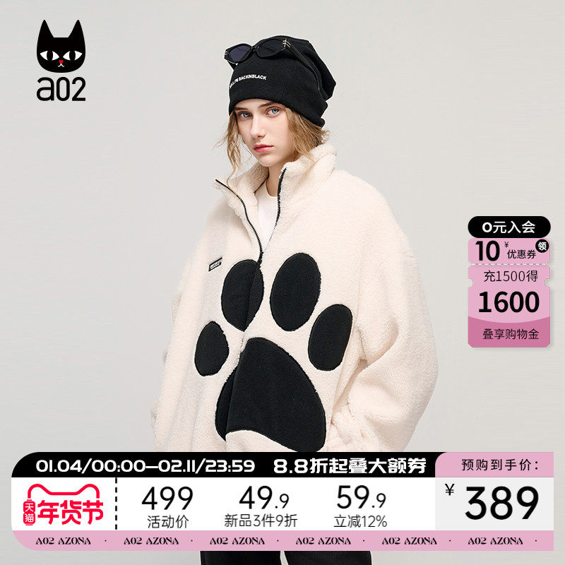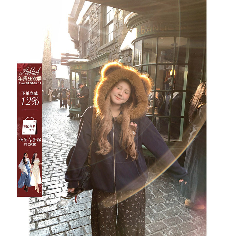 安妮不火 kitty贴布绣摇粒绒连帽卫衣外套女微胖大码可爱毛领外套