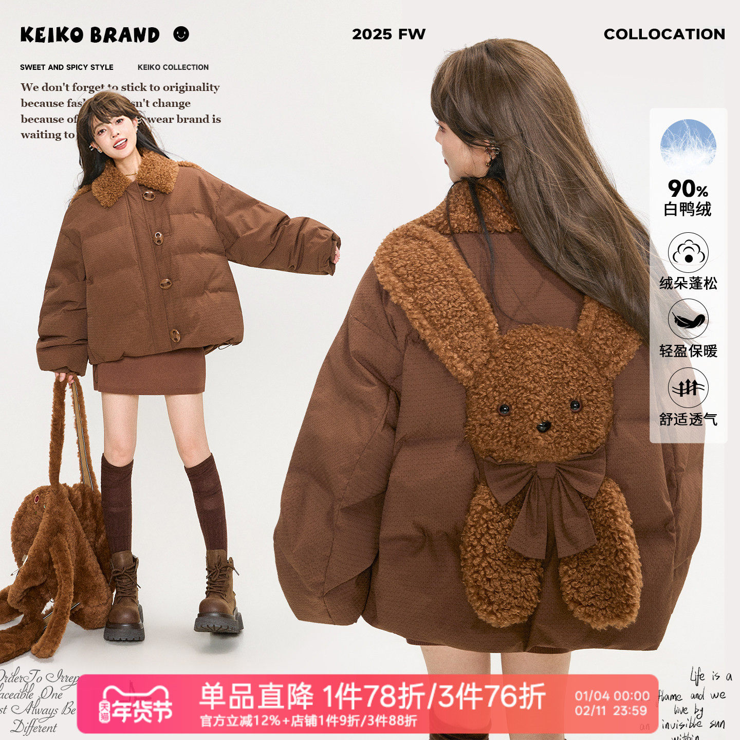 KEIKO[手工贴布萌兔] 巴恩风咖色短款羽绒服女冬季白鸭绒加厚外套