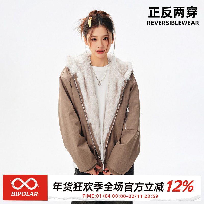 BIPOLAR贴布双面穿毛领连帽棉服设计感毛绒外套上衣男女宽松夹克