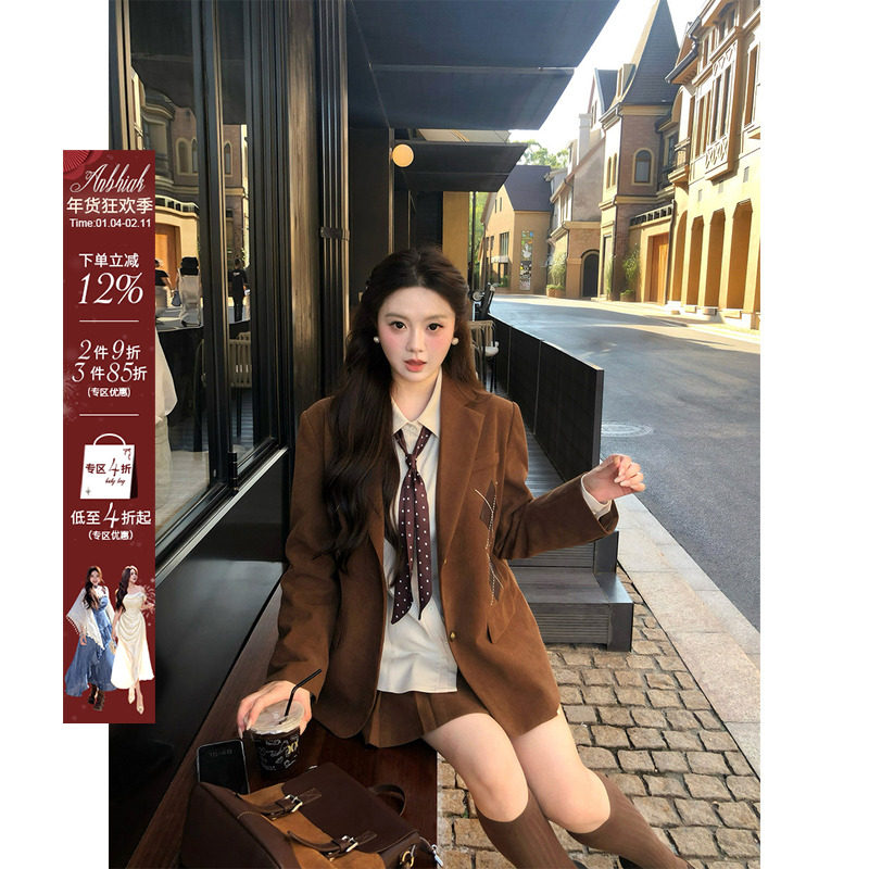 安妮不火 减龄学院风格纹贴布绣三件套女微胖大码灯芯绒西装外套